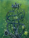 Buttons all the Way DownOil on canvas 30 × 40”. A playful musing of “What if Corduroy met Cthulhu?” The transformation of tentacles into fabric and suckers into buttons integrates with a lost object of childhood affection.